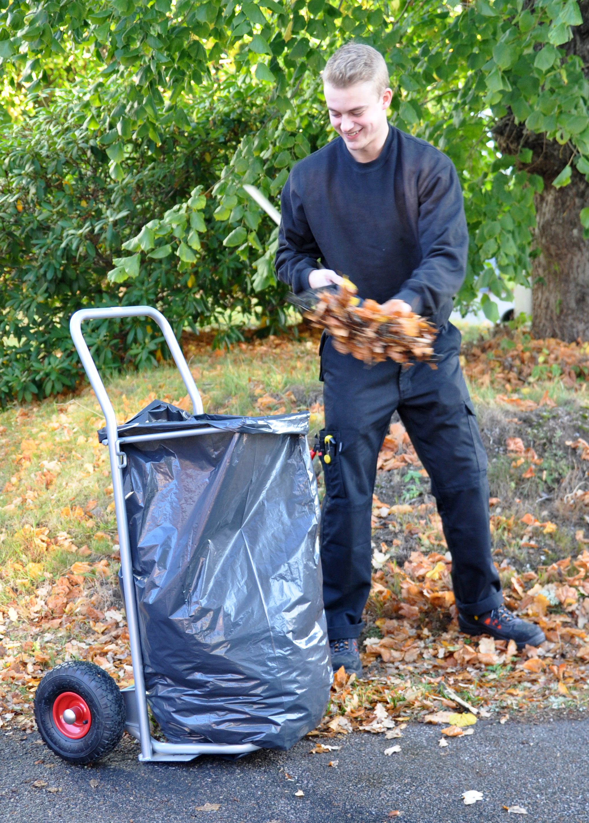 Sækkevogn med tykke 260 mm, luft hjul. Kan bruges både ude og inde. Passer til en 125 l sæk.