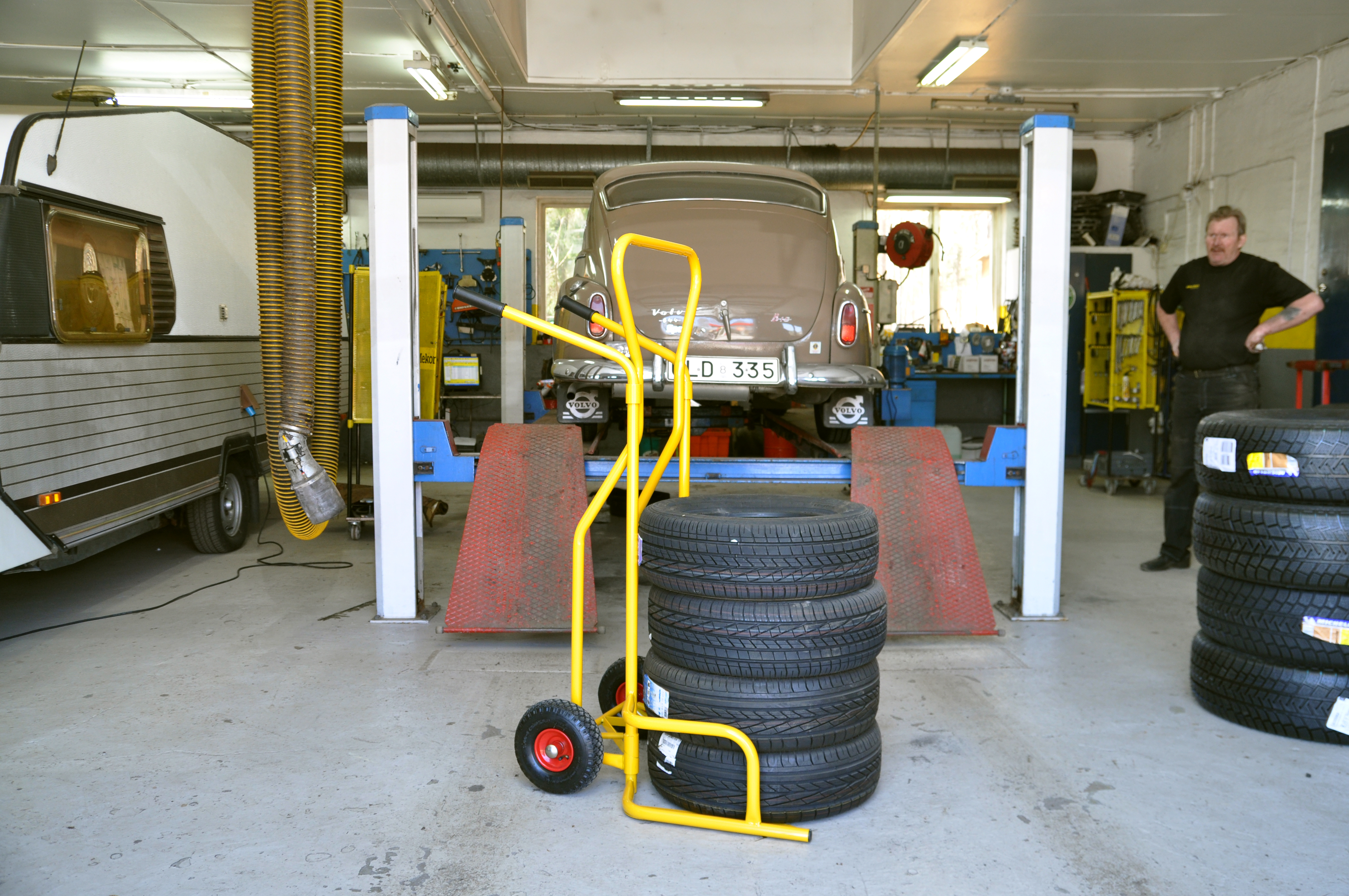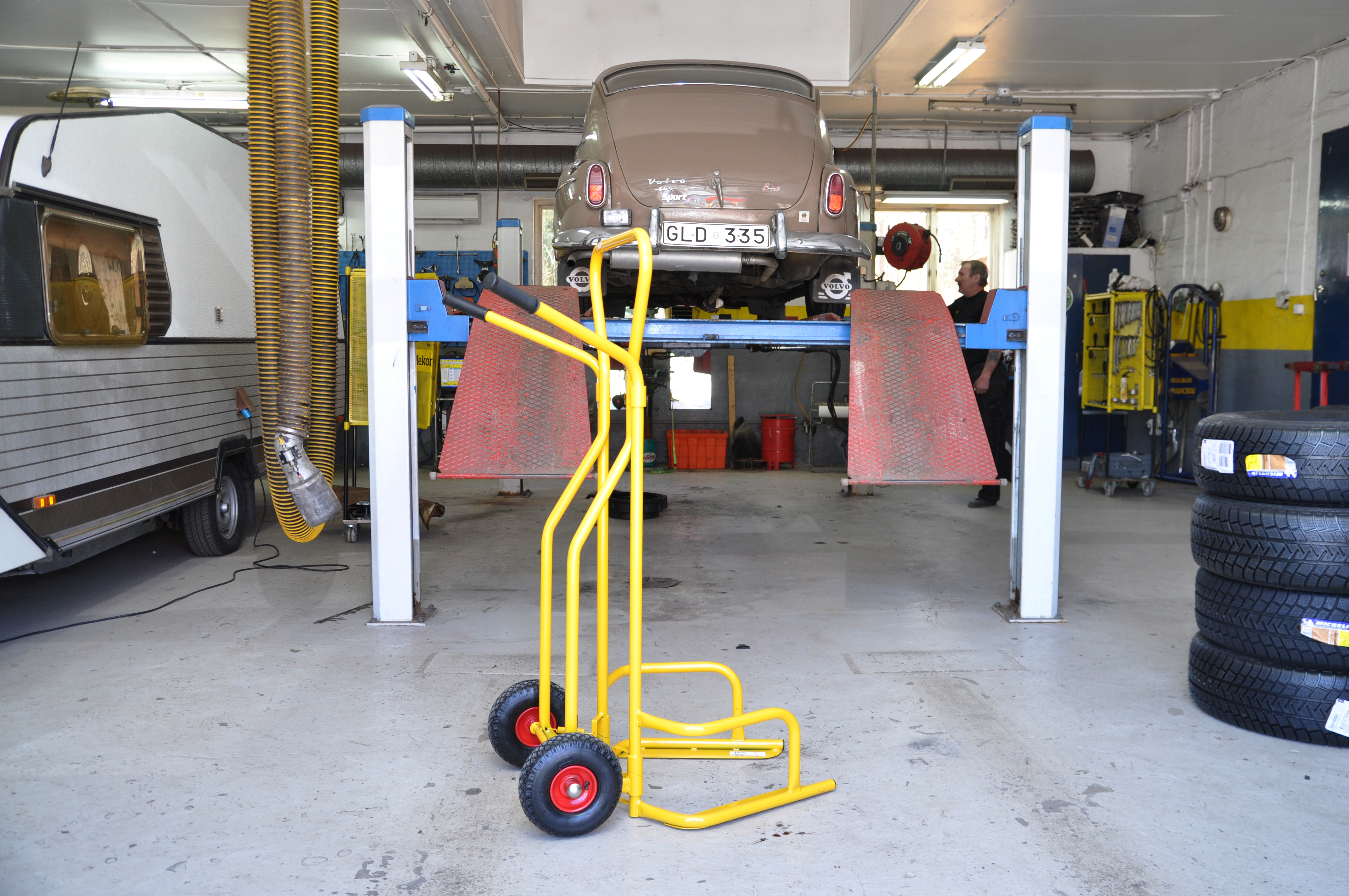 Kraftig dækvogn, der gør det meget nemt at transportere dæk. Gode hjul gør det muligt at benytte den på alle underlag.