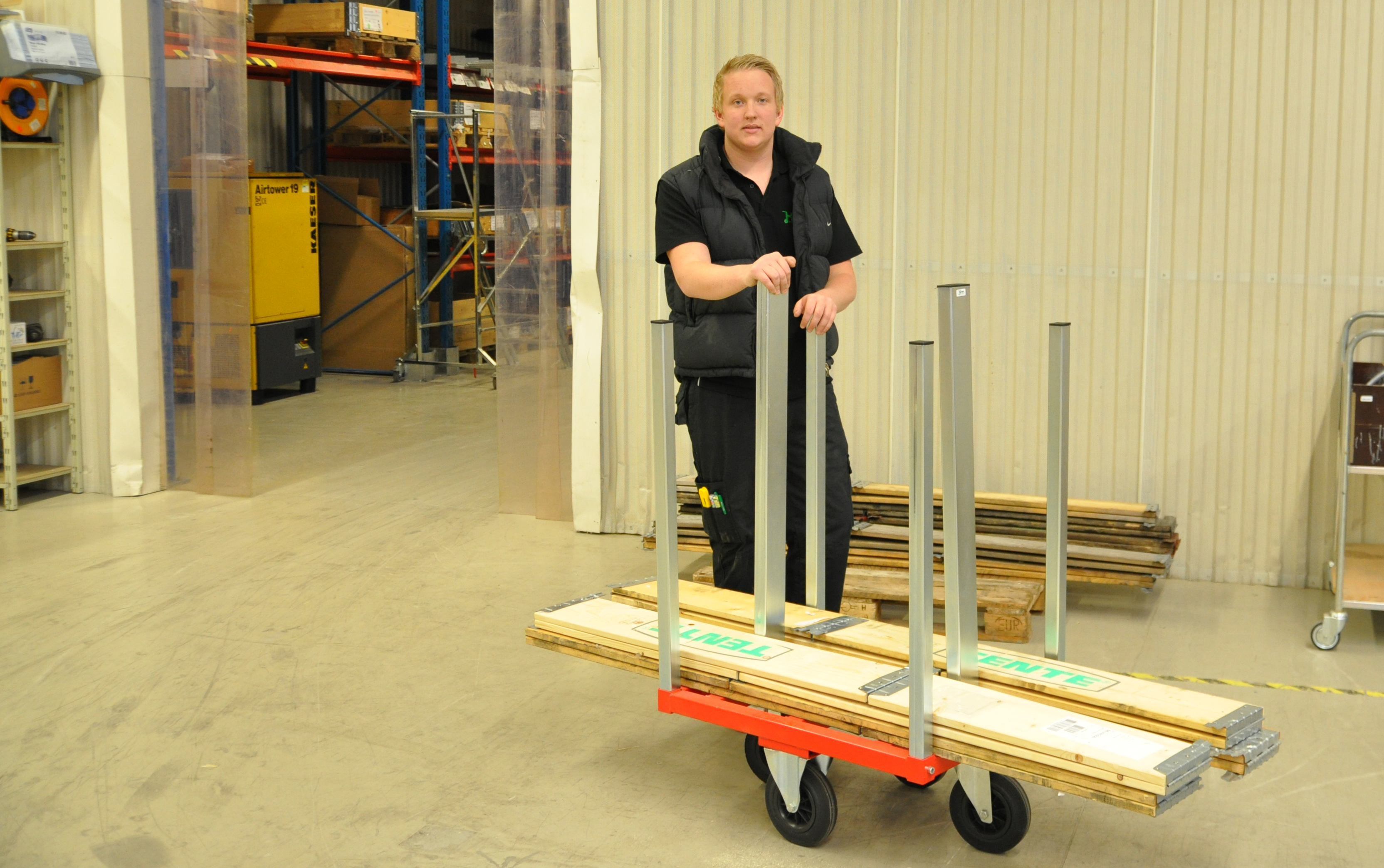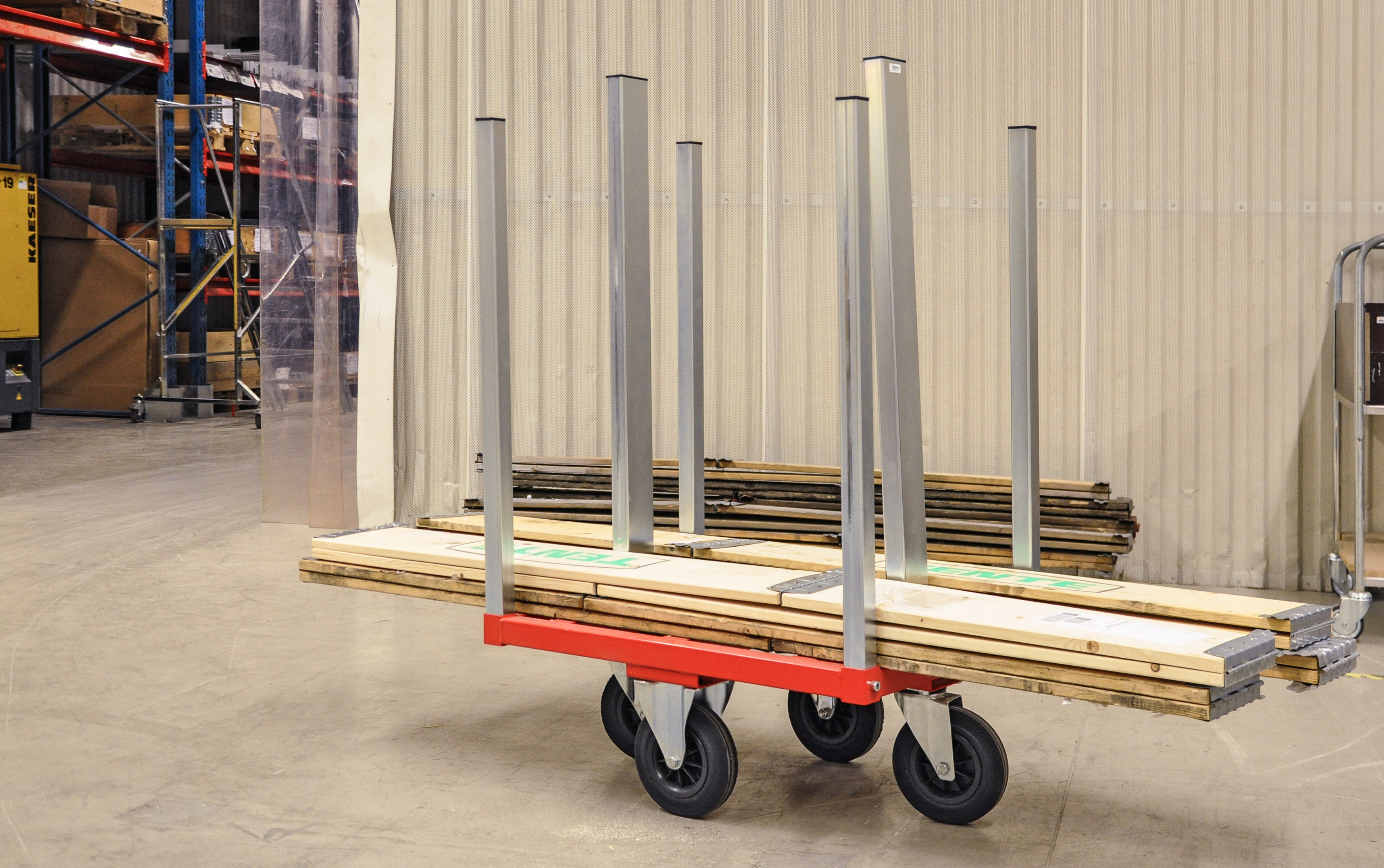 Pulverlakeret med stolper af elektrogalvaniseret stål Fuldsvejset Maksimalt antal pallerammer: 36 stk. De faste hjul skal monteres på den lange side for nem bevægelse Længde af stolperne: 900 mm 2 faste og 2 drejbare hjul i massiv gummi, 200 x 50 mm Kapacitet: 300 kg