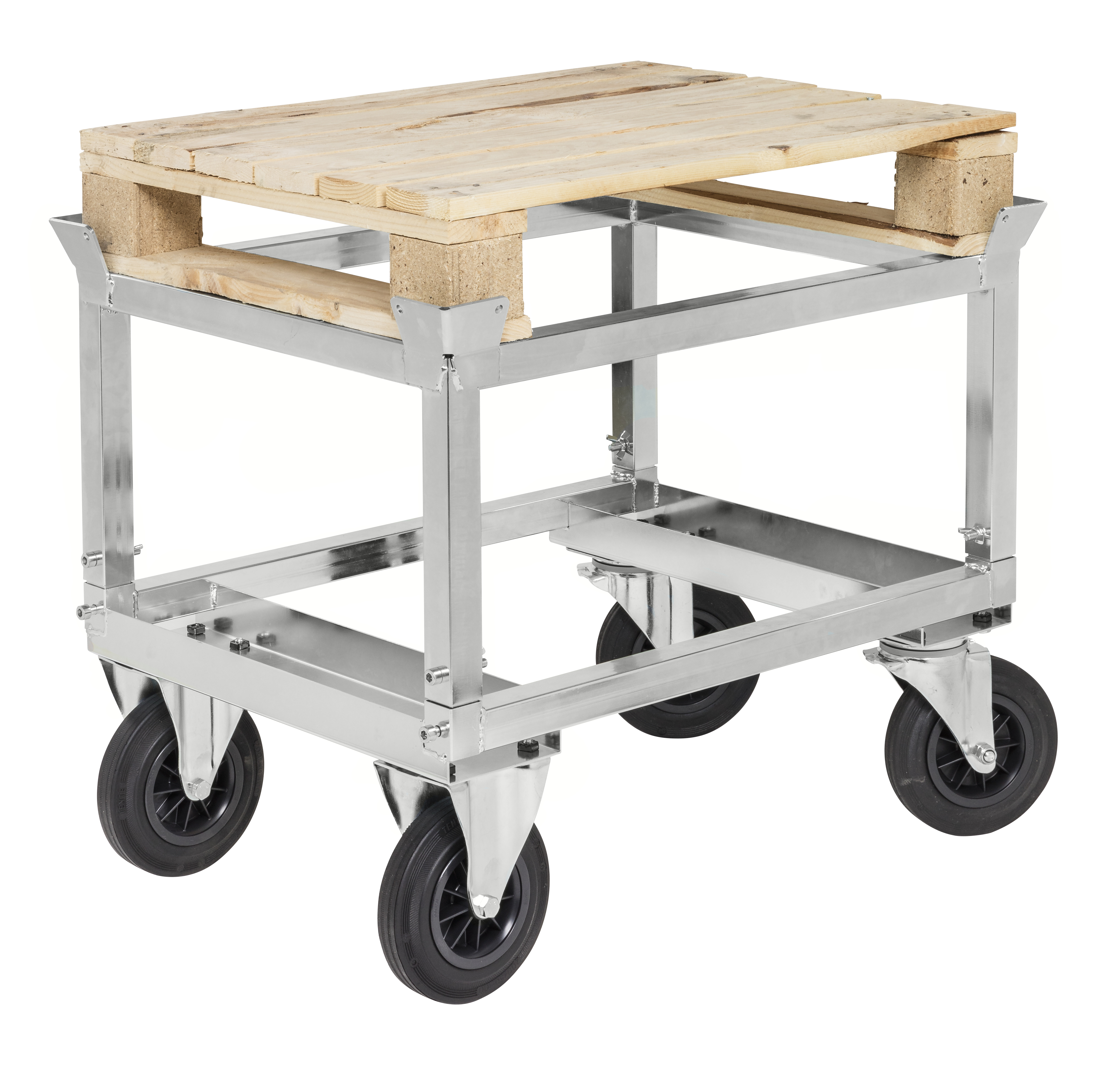 Vores pallevogne passer til paller med målene: 800x600 mm, 1200x800 mm og 1200x1000 mm. Tilgængelig i forskellige modeller, med eller uden bremser.